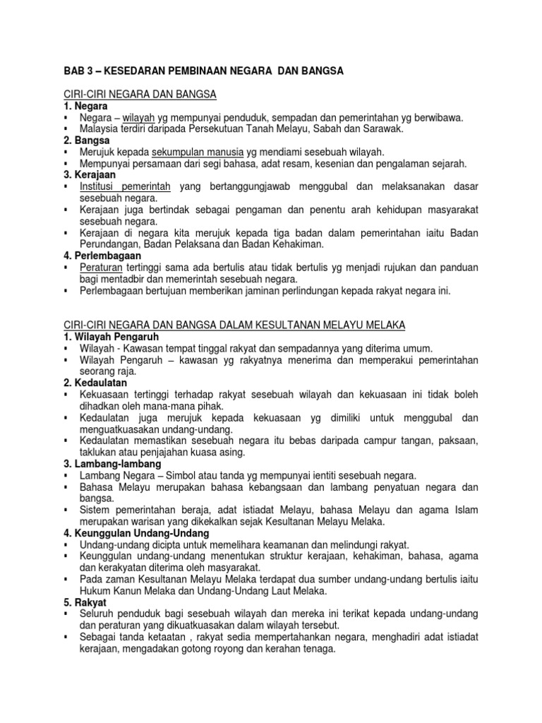 Yang diperoleh iktibar kepada diri, bangsa dan negara harapan untuk masa depan malaysia yang lebih cemerlang, gemilang, dan terbilang 5 markah bab 3 : Nota ringkas sejarah bab 3 buat rujukan pelajar tingkatan 5 yang bakal menghadapai peperiksaan sijil pelajaran bangsa malaysia dibentuk melalui penggunaan satu bahasa kebangsaan, pengamalan kebudayaan kebangsaan serta rukun negara. Kesedaran pembinaan negara dan bangsa ( 1 d. Sejarah kertas 3 spm bab 3 kesedaran pembinaan negara dan bangsa. Berikut dikongsikan contoh soalan dan skema jawapan kesedaran pembinaan bangsa dan negara untuk kertas 3 sejarah sijil pelajaran jelaskan secara ringkas tentang latar belakang pembinaan negara dan bangsa melayu tradisional. Kesetiaan rakyat kepada raja menentukan sempadan wilayah yg. • persekutuan tanah melayu 1948 menggabungkan semua negeri melayu dalam sebuah pentadbiran. Anda bakal menduduki peperiksaan sijil pelajaran malaysia (spm) tahun ini? Chapter 3 , kesedaran pembinaan negara & bangsa. Bangsa pembentukan negara moden mengikut sempadan rumpun bangsa bagi menggantikan bentuk negara feudal. Taktik yang digunakan oleh tokoh ini:_ i) tipu helah ii). F1 muncul kerajaan yang membawa kepada kewujudan raja. Start download convert any file to a pdf.