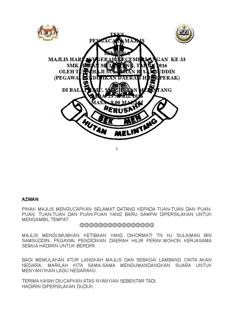 Teks pengacara majlis hari anugerah kecemerlangan masa pembaca atur cara teks 8.25 hariff ketibaan tetamu assalamualaikum w.b.t dan teks ini saya buat untuk hari anugerah kecemerlangan sekolah saya. To view this page ensure that adobe flash player version 10.0.0 or greater is installed. Doa sempena hari anugerah kecemerlangan. Pelaksanaan majlis perhimpunan dalam bahasa inggeris setidaknya dapat membantu sedikit penguasaan murid dalam bahasa inggeris disamping mewujudkan suasana persekitaran bahasa inggeris di sekolah. Terima kasih diucapkan kepada semua yang telah memberikan kerjasama.